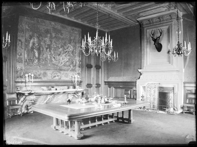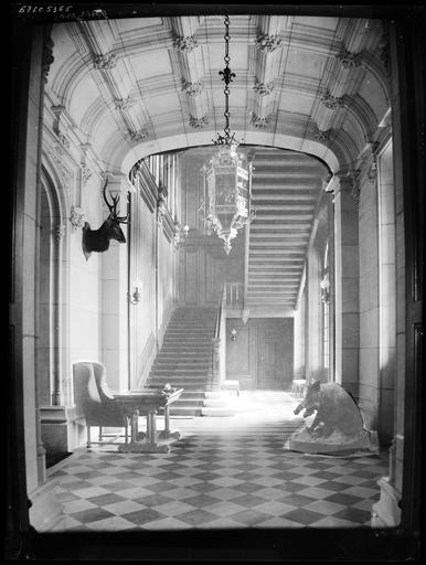 Ce château “de rêve” possède des espaces démesurés, construit à la gloire de la chasse, mais possédant des fonctions bien séparées : Les espaces de réceptions, les espaces réservés aux services et enfin ceux consacrés à la vie familiale. Ainsi le rez-de-chaussée est plus destiné à la réception, la porte d’honneur ouvre sur un hall qui dessert plusieurs pièces principales, construites en enfilade, servaient exclusivement de réception. Elles sont chacune ornées de cheminées copiées des cheminées royales de François 1er. On trouve ainsi un salon, une salle à manger, salle de billard et fumoir. On trouve également des vestibules et des vestiaires pour accueillir les chasseurs. Un escalier d’honneur en bois et orné de têtes de lions sculptées, dessert les deux premiers étages où étaient les chambres d’amis (le pavillon à l’ouest étant entièrement réservé aux appartements privés et au cabinet de travail). Chaque chambre disposant d’un cabinet de toilette particulier et d’une pièce d’eau. Enfin 22 chambres de domestiques sont disposées sous les toits et bénéficient également de toutes les commodités. On trouve également sous les toits une autre salle de billard (réservée aux domestiques) et une infirmerie. Un ingénieux système d’ascenceur, de descente à couvert et de rails permettait l’acheminement du bois, de la nourriture… D’autres escaliers privés ou de services, permettaient d’atteindre des dégagements comme des antichambres. Il ne faudrait pas oublier non plus le sous-sol entièrement dédié au service et muni d’une voie de wagonnets déservant le garde manger, une grande cuisine et une plus petite pour les maîtres d’hôtel, une laverie, les montes plats, les toilettes des domestiques, une cave à charbon, des caves à vin…