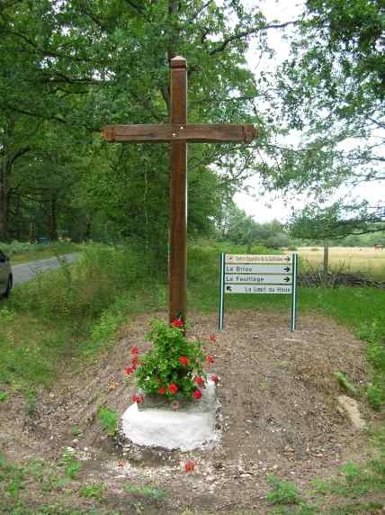 I.- La croix des Bois, la seule dont nous avons retrouvé la dénomination grâce à un document datant du 3 septembre 1835 répertoriant les bornages des terrains appartenant à la commune. Vétuste, elle a fait l’objet d’un remplacement par la municipalité et a été bénie le 3 septembre 2006 par l’abbé Thierry Chaudun, curé de la paroisse Notre-Dame des Bruyères. Elle se situe à l’embranchement de la route du Feuillage et de celle de La Loeuf du Houx.