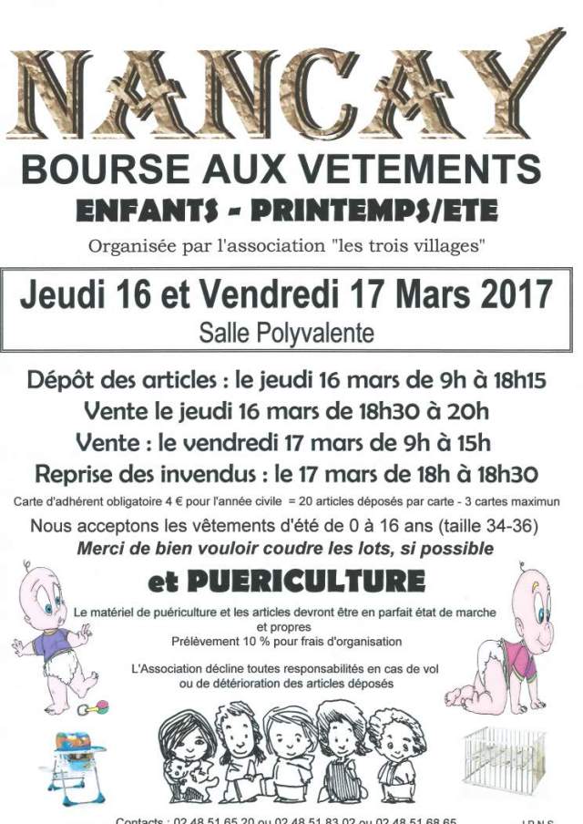 Bourse aux vêtements enfants printemps-été, et à la puériculture, le jeudi 16 mars et vendredi 17 à la salle polyvalente de Nançay