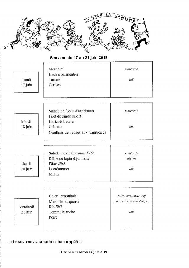 Menu du 17 au 21 juin 2019