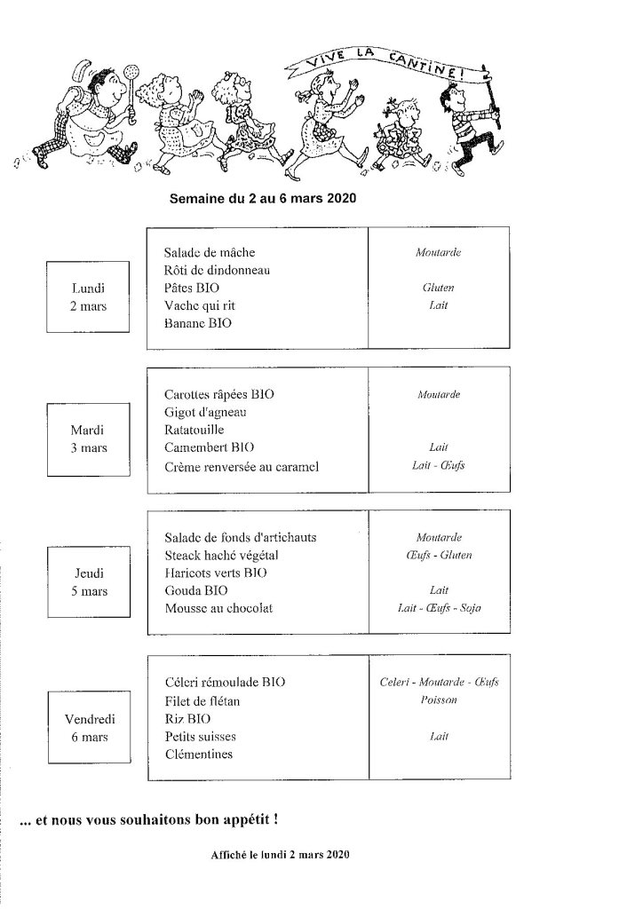 Menu de la cantine scolaire du 2 au 6 mars 2020