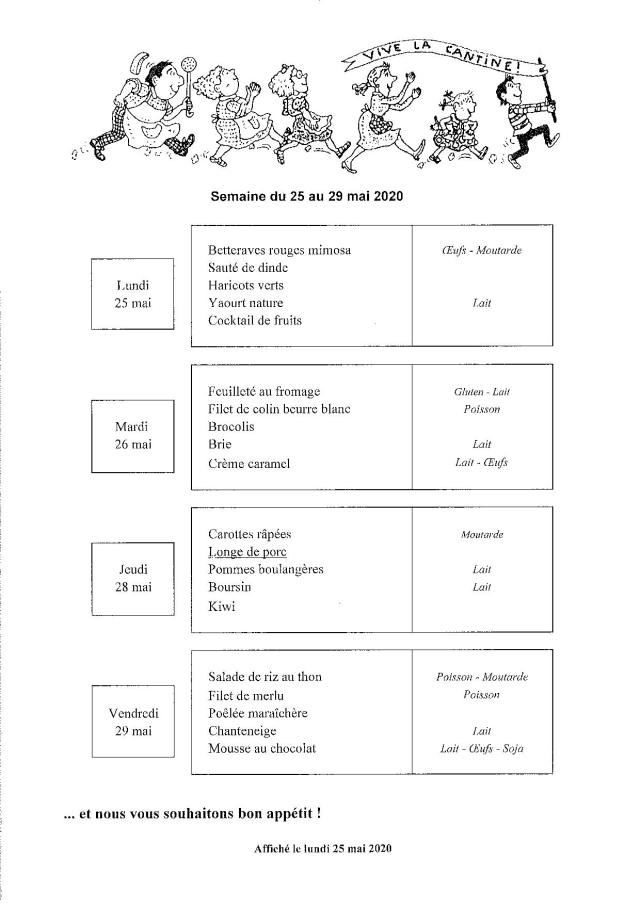 Menu de la cantine scolaire du 25 au 29 mai 2020