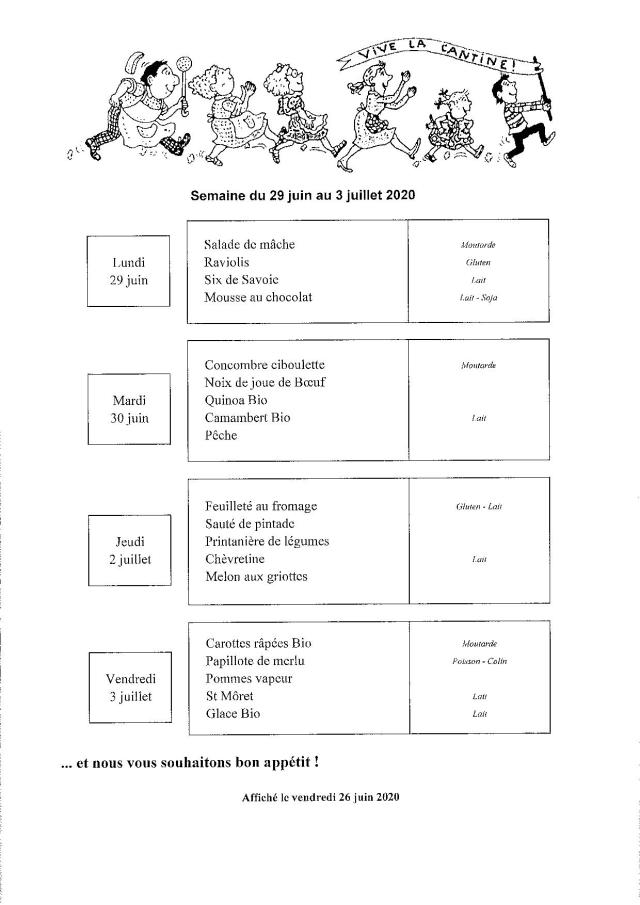 Menu de la cantine scolaire du 29 juin au 3 juillet 2020
