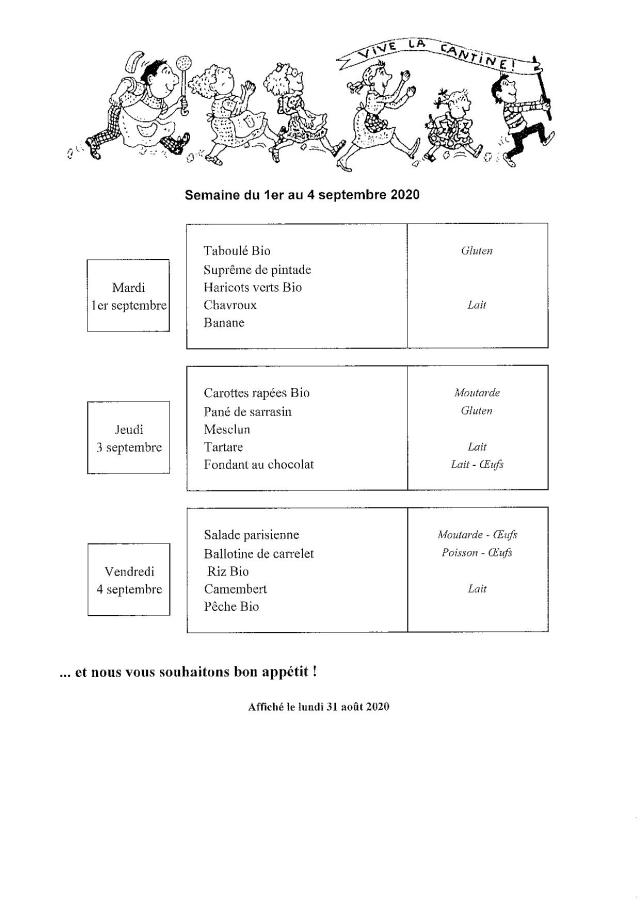 Menu de la cantine scolaire du 1er au 4 septembre 2020