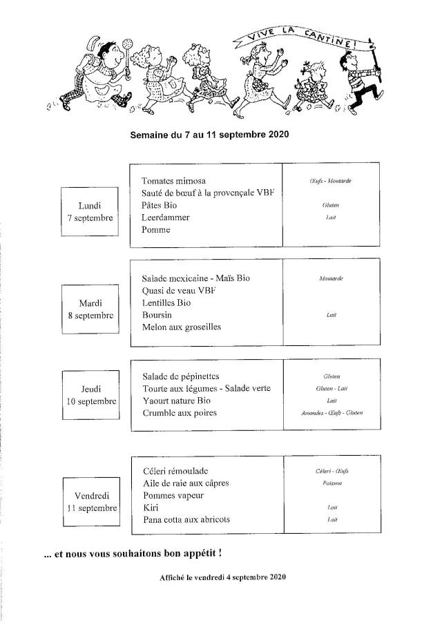 Menu de la cantine scolaire du 7 au 11 septembre 2020