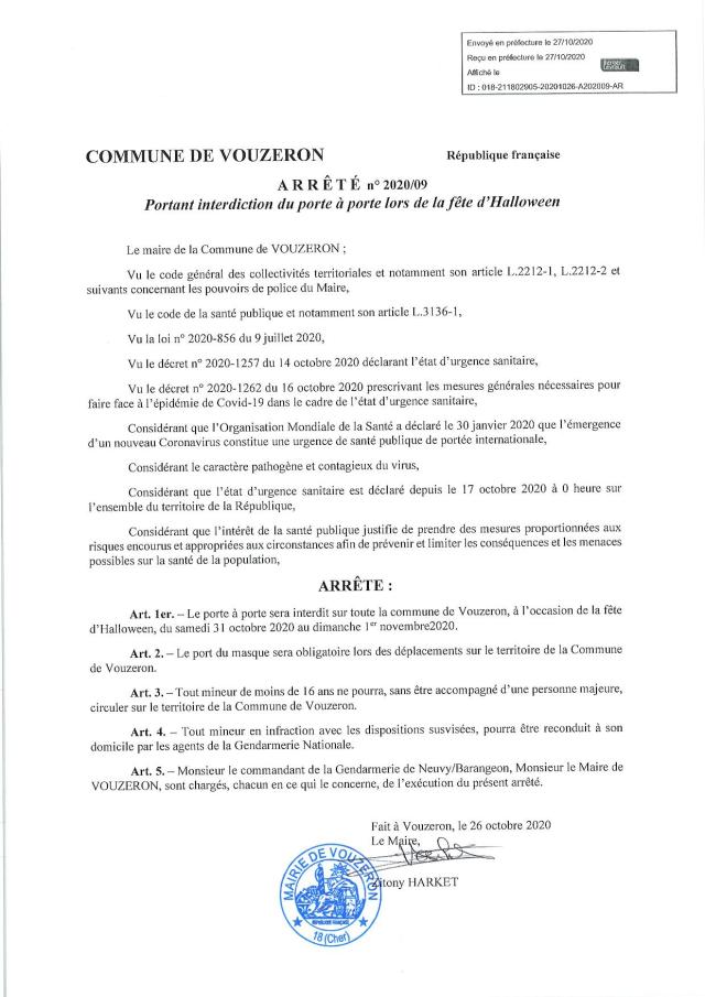 Arrêté portant interdiction du porte à porte à l’occasion de la fête d’Halloween