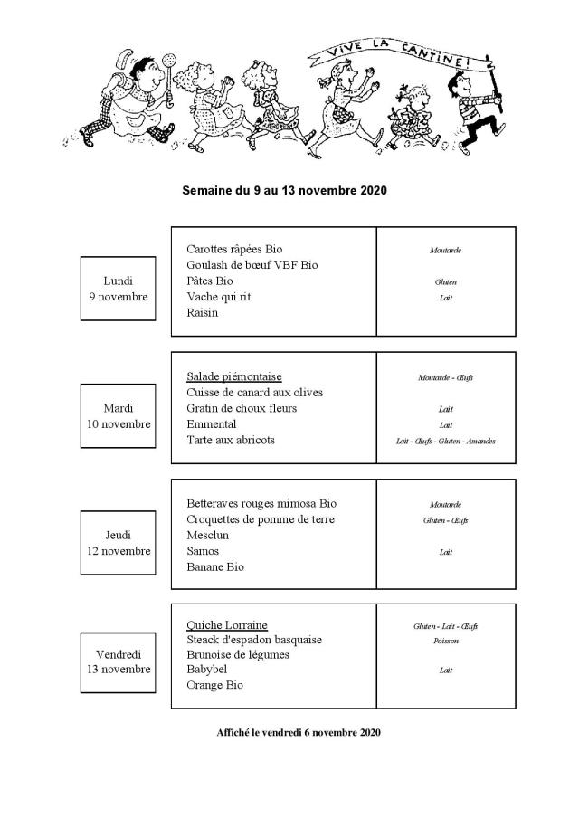 Menu de la cantine scolaire du 9 au 13 novembre 2020