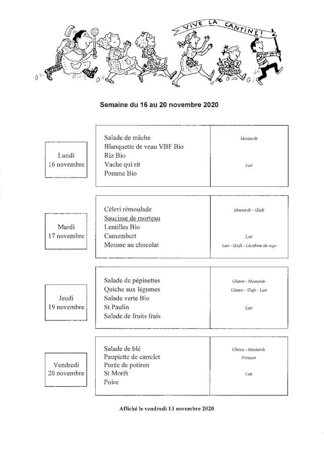 Menu de la cantine scolaire du 16 au 20 novembre 2020