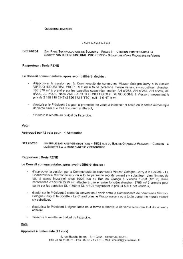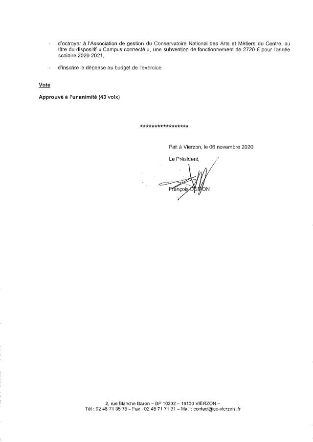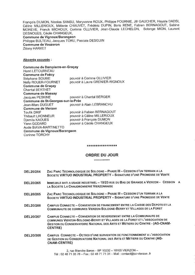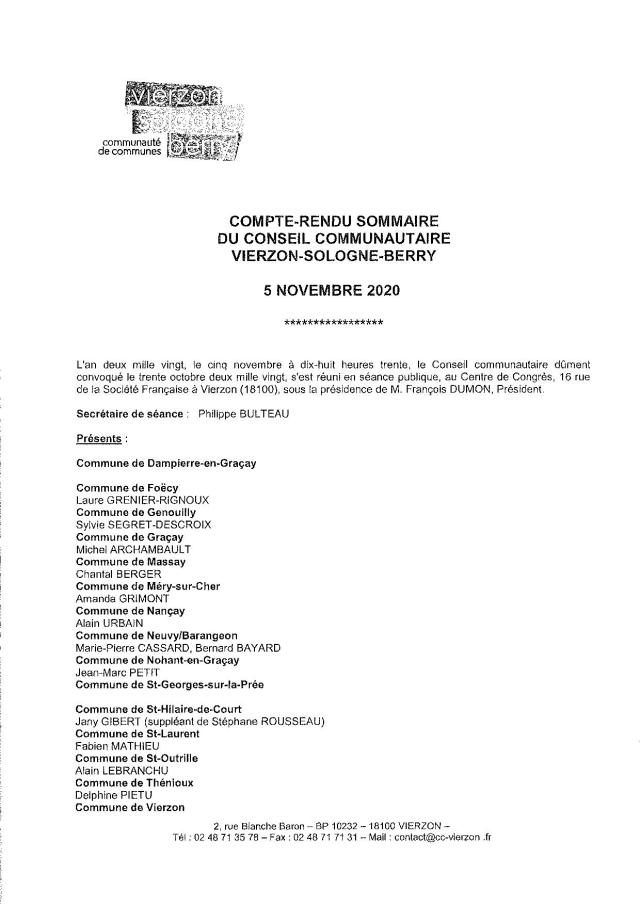 Compte-rendu sommaire du Conseil Communautaire Vierzon-Sologne-Berry du 5 novembre 2020