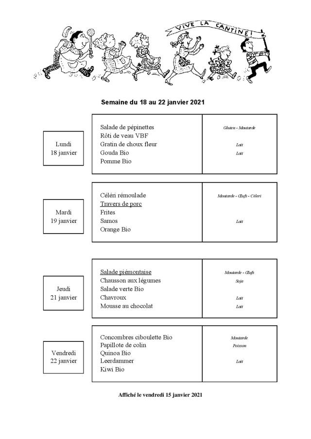 Menu de la cantine scolaire du 18 au 22 janvier 2021