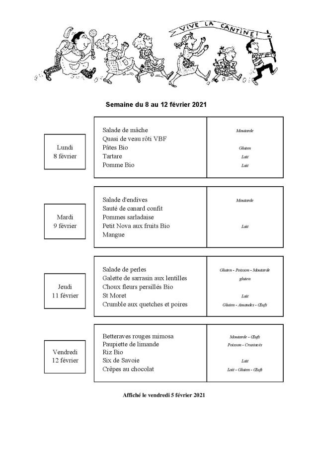 Menu de la cantine scolaire du 8 au 12 février 2021