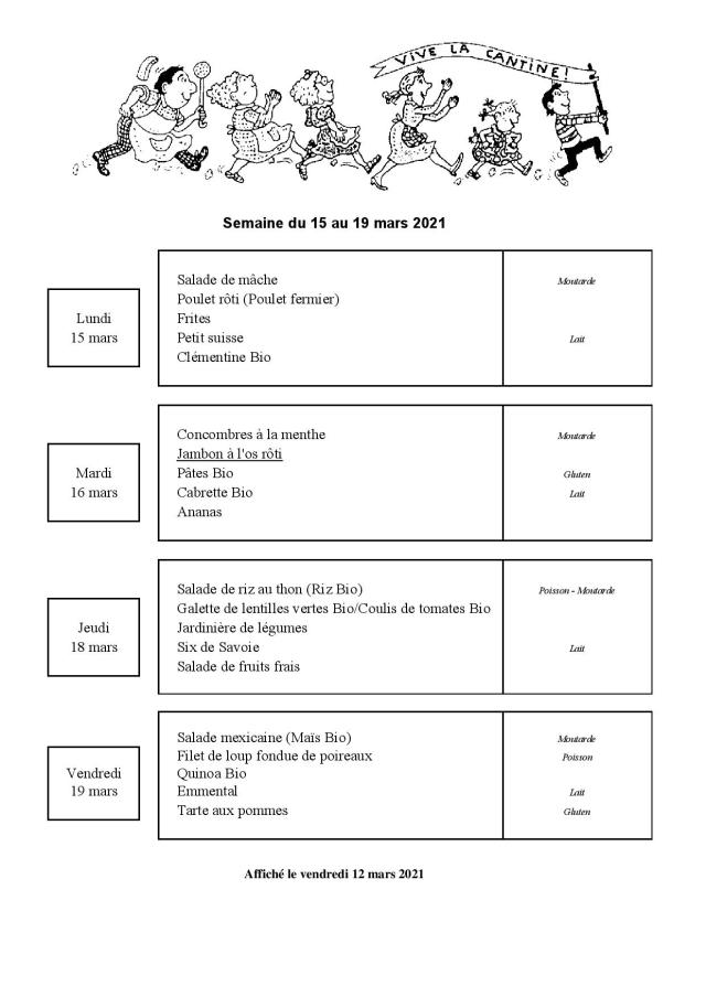 Menu de la cantine scolaire du 15 au 19 mars 2021