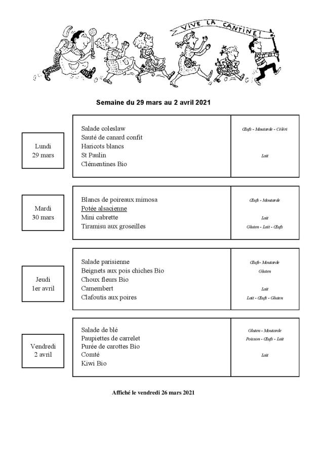 Menu de la cantine scolaire du 29 mars au 2 avril 2021