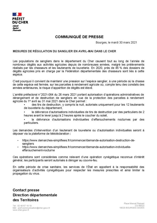 Mesures de régulation du sanglier en avril et mai dans le Cher
