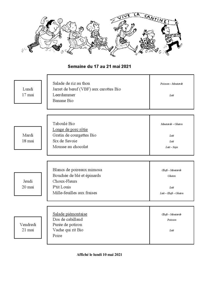 Menu de la cantine scolaire du 17 au 21 mai 2021