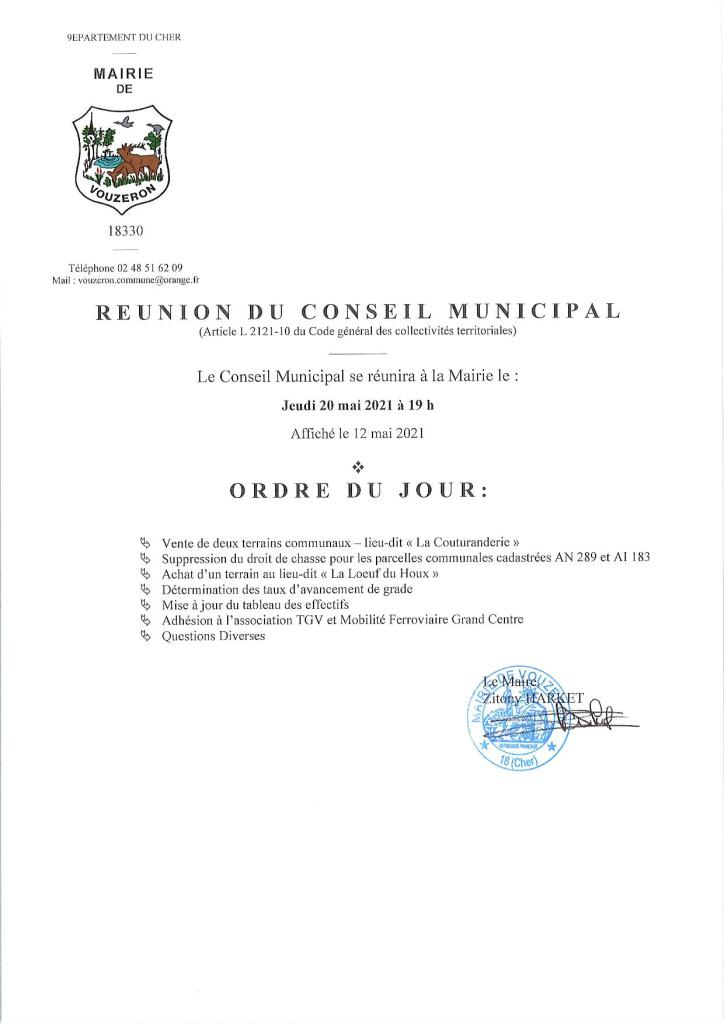 Réunion du Conseil Municipal – Jeudi 20 mai 2021 à 19h