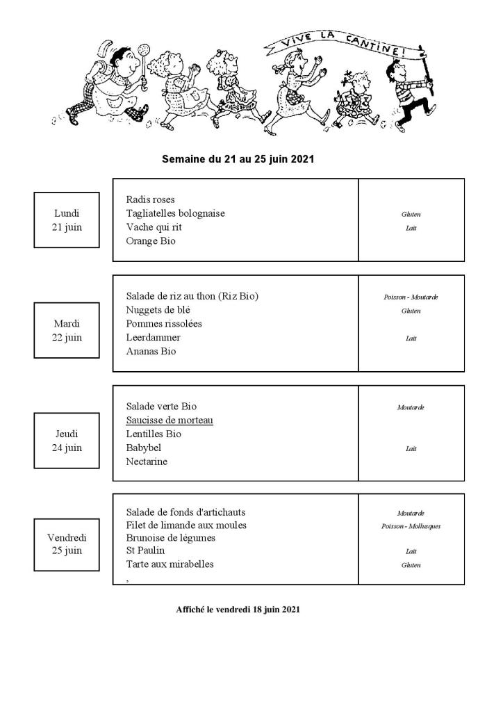 Menu de la cantine scolaire du 21 au 25 juin 2021