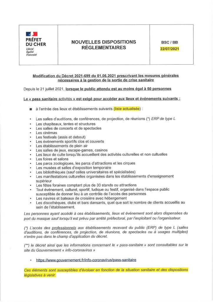 Pass sanitaire – Nouvelles dispositions règlementaires