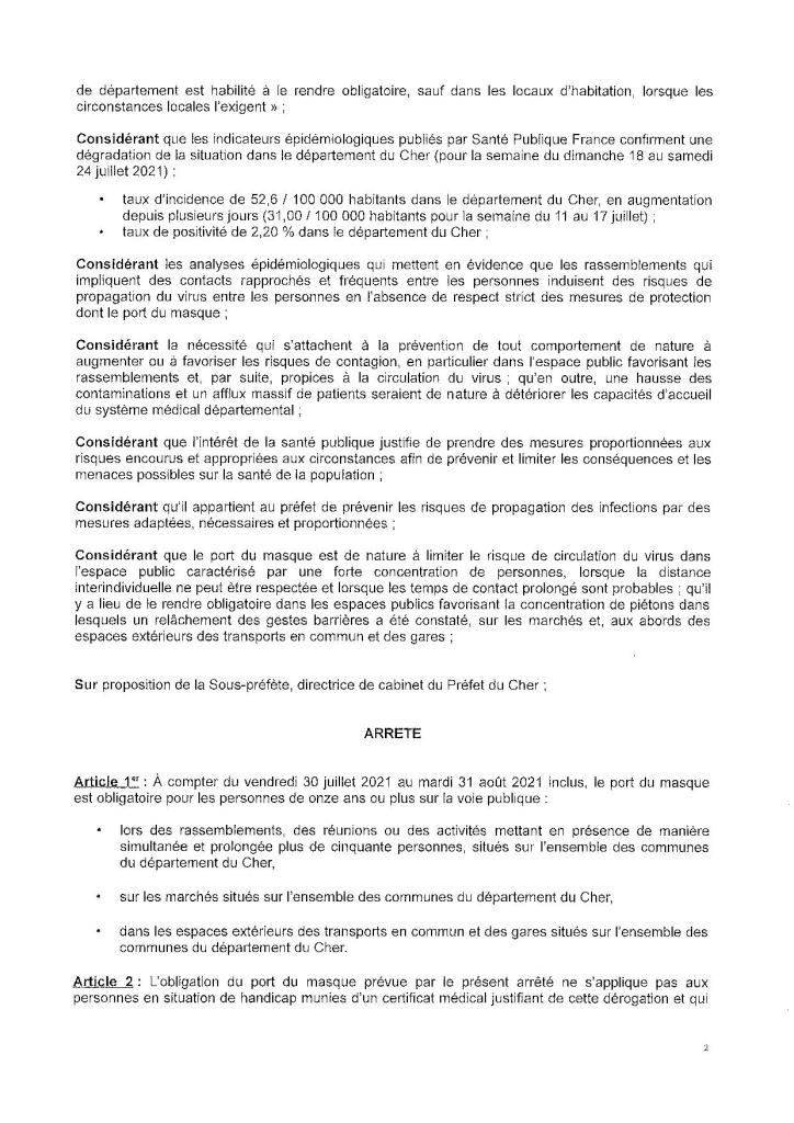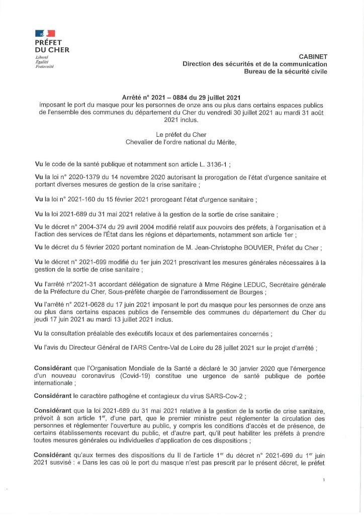 Port du masque – Arrêté n° 2021-0884 du 29 juillet 2021