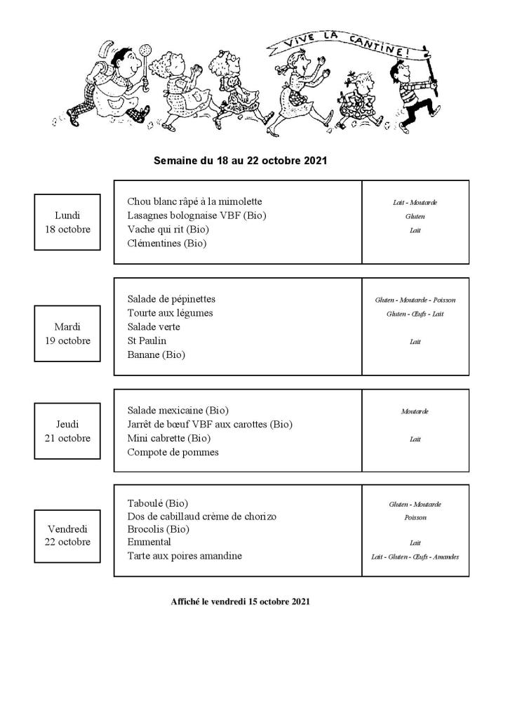Menu de la cantine scolaire du 18 au 22 octobre 2021