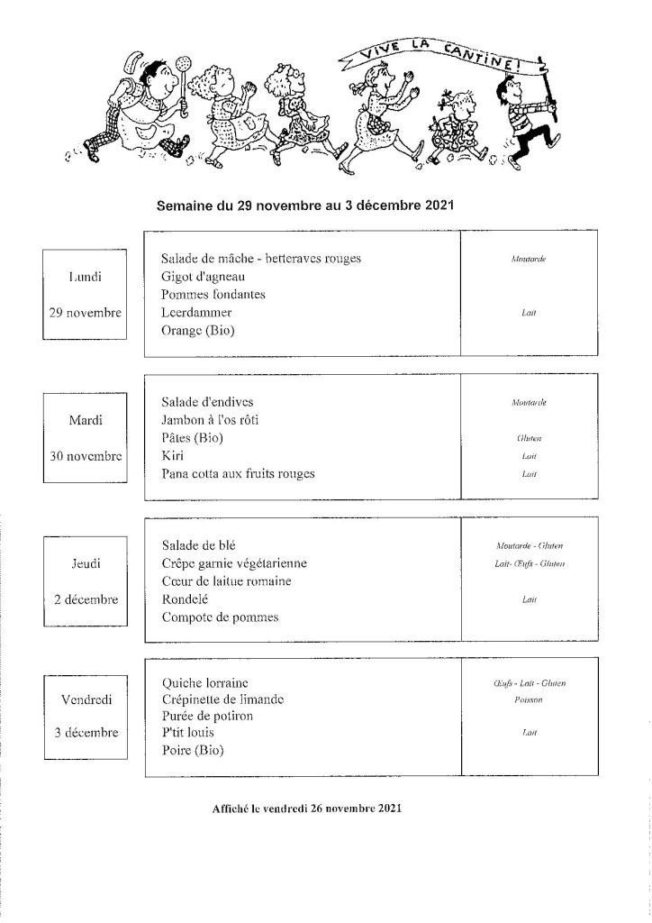 Menu de la cantine scolaire du 29 novembre au 3 décembre 2021