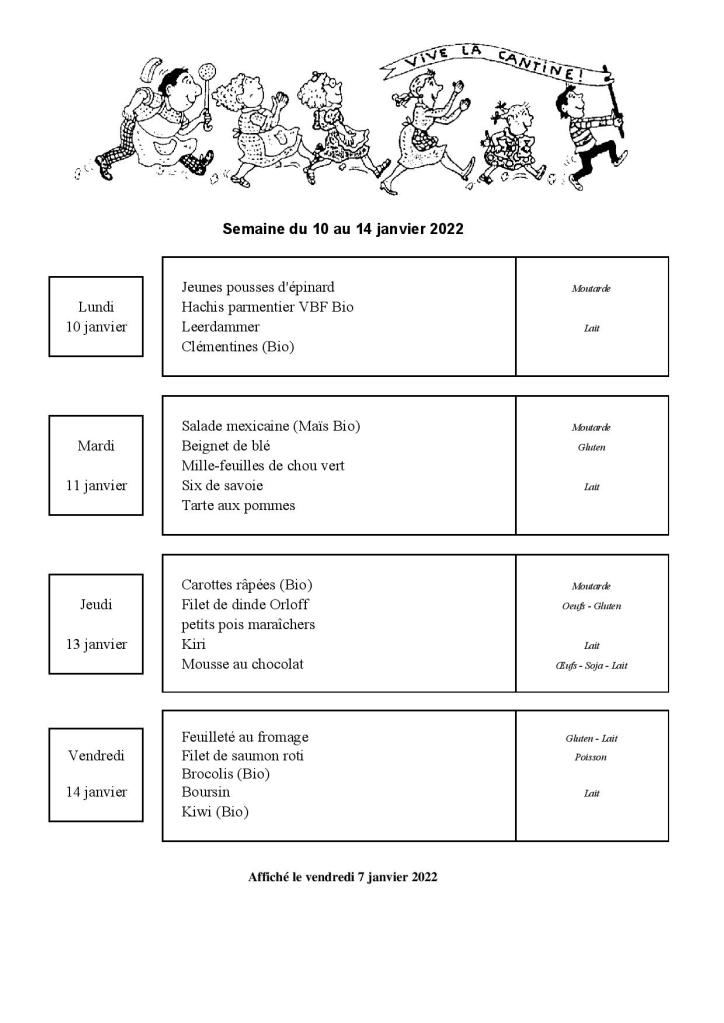 Menu de la cantine scolaire du 10 au 14 janvier 2022