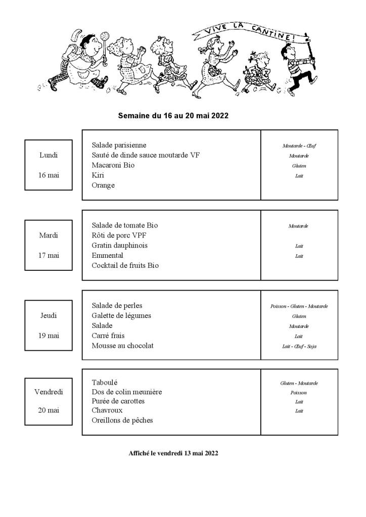 Menu de la cantine scolaire du 16 au 20 mai 2022