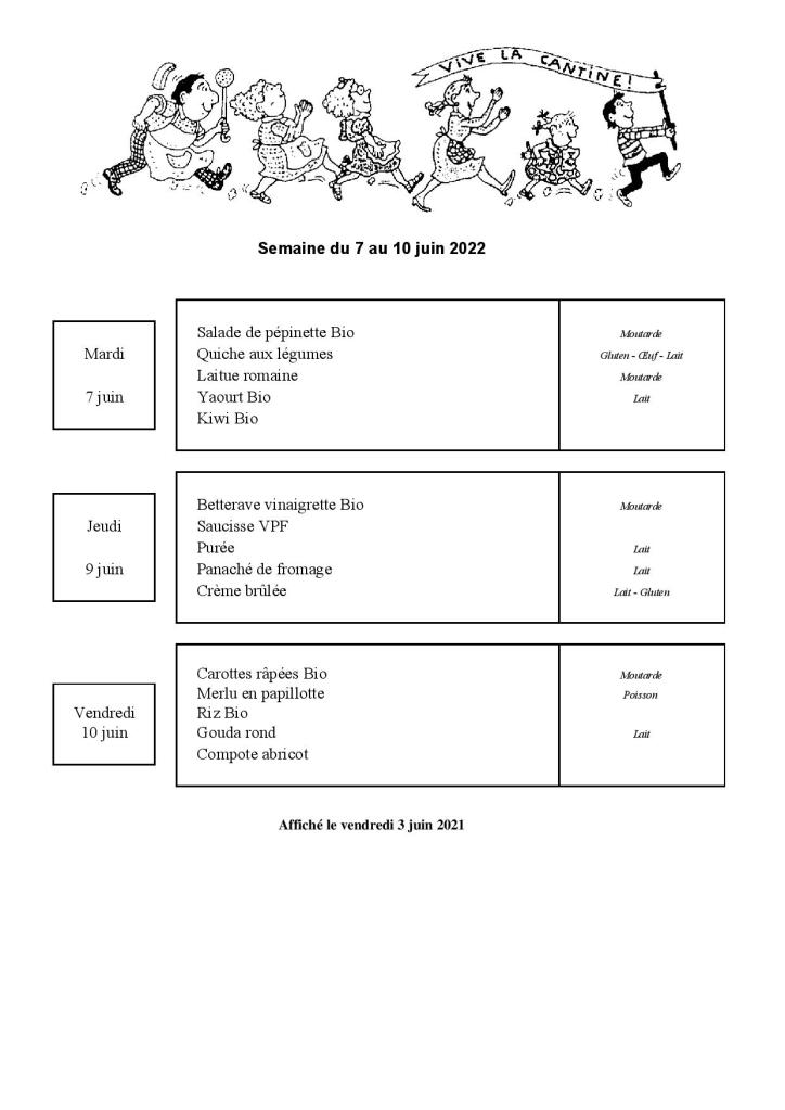 Menu de la cantine scolaire du 7 au 10 juin 2022