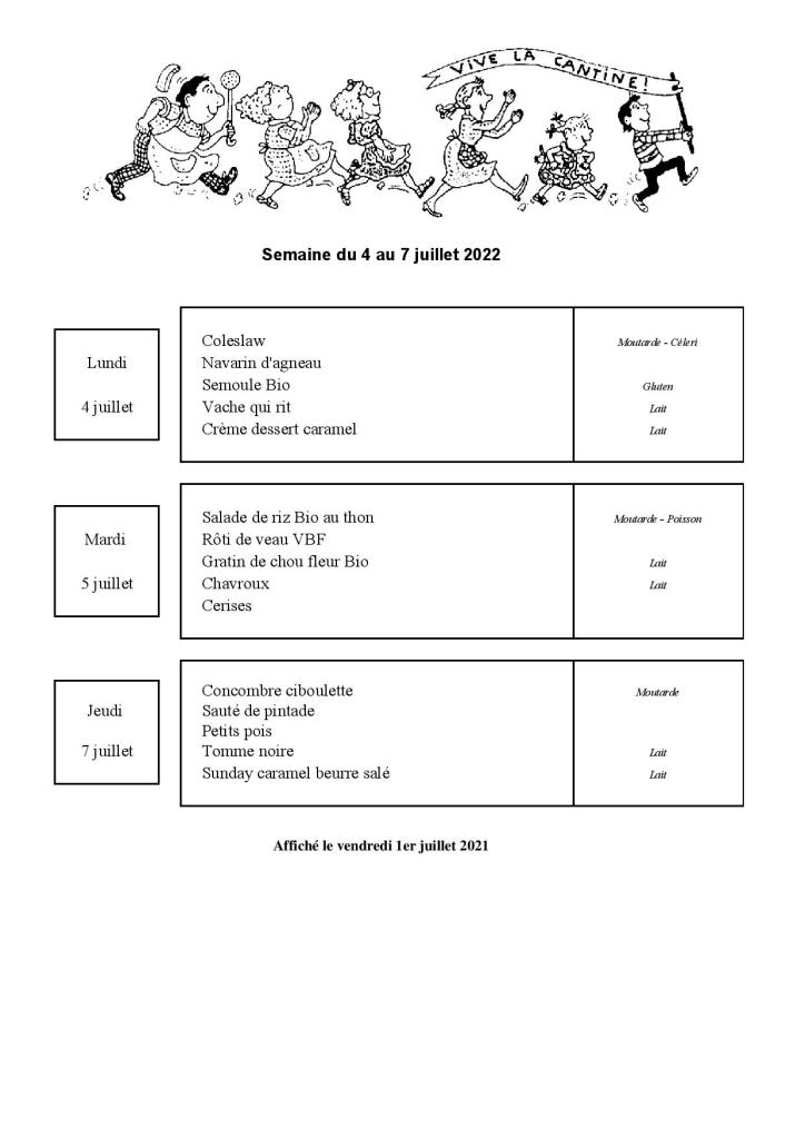 Menu de la cantine scolaire du 4 au 7 juillet 2022