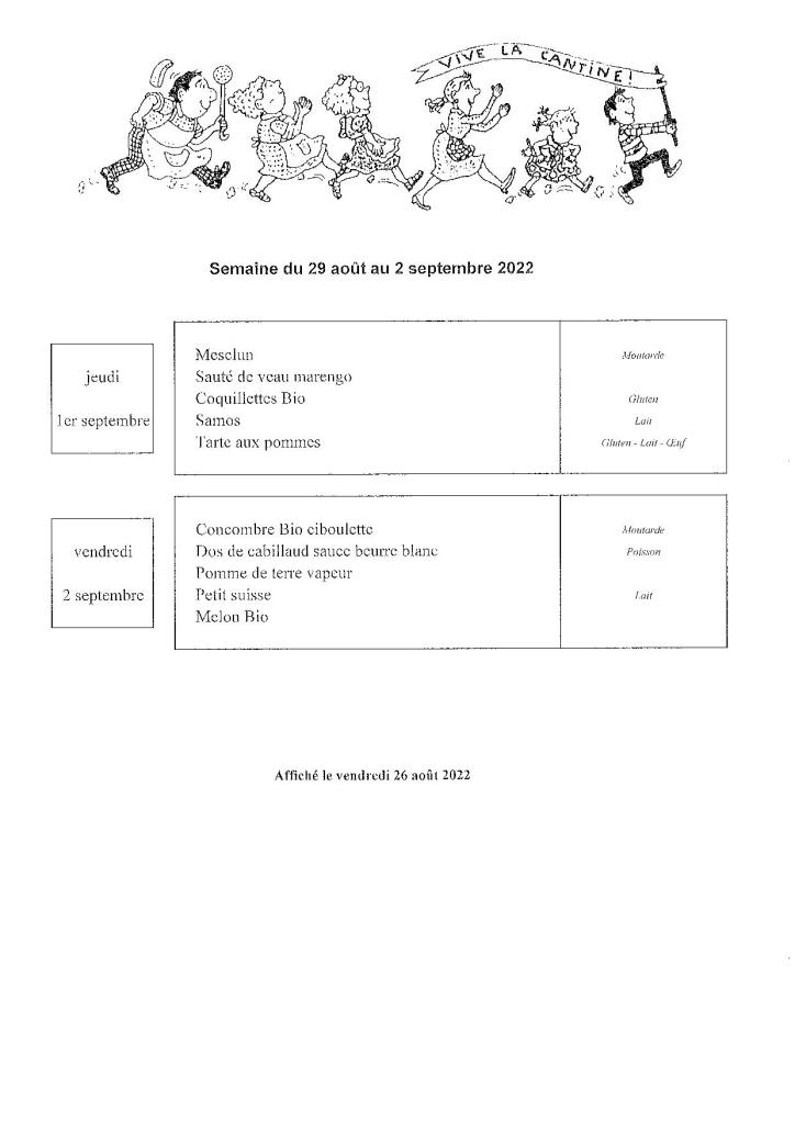 Menu de la cantine scolaire du 1er et 2 septembre 2022
