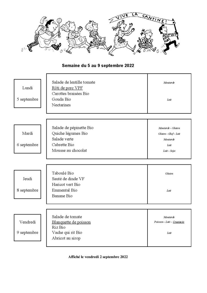 Menu de la cantine scolaire du 5 au 9 septembre 2022
