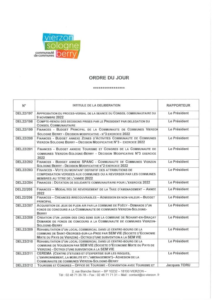 Ordre du jour du Conseil Communautaire du 1er décembre