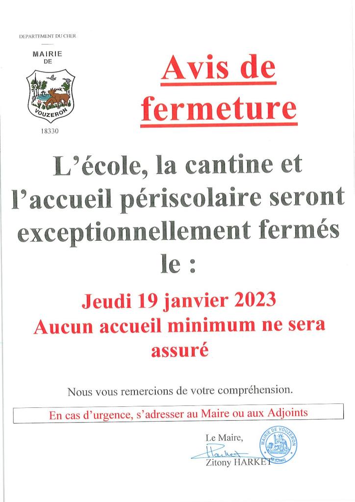 Avis de fermeture exceptionnelle 19 janvier 2023
