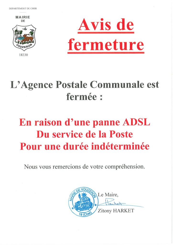 Fermeture de l’Agence Postale pour une durée indéterminée