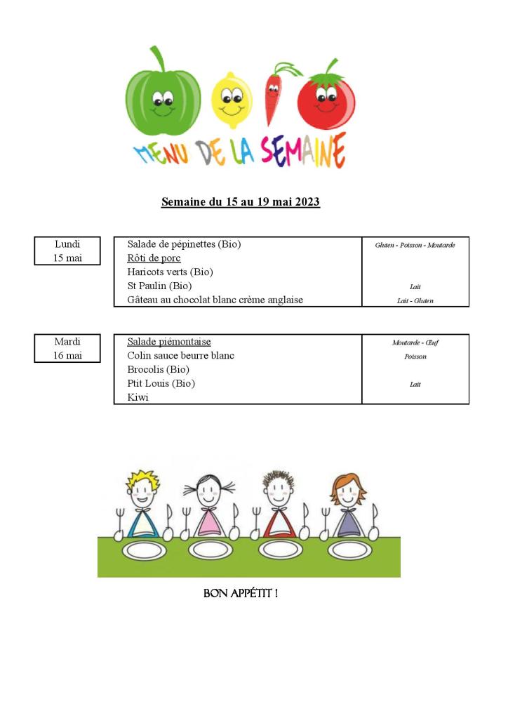 Menu de la cantine scolaire du 15 au 19 mai 2023