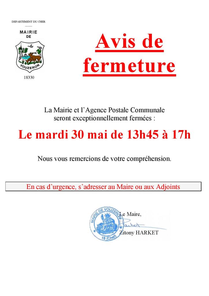 Fermeture exceptionnelle de la Mairie et de l’Agence Postale Communale