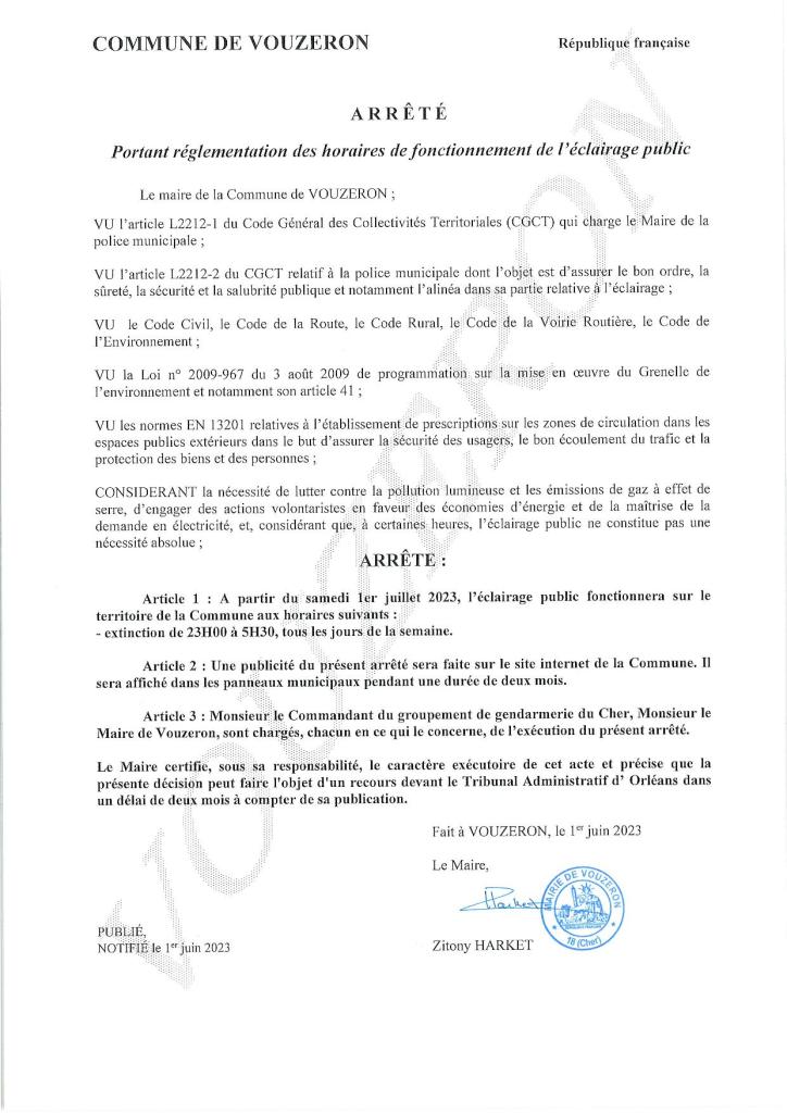 Arrêté portant réglementation des horaires de fonctionnement de l’éclairage public