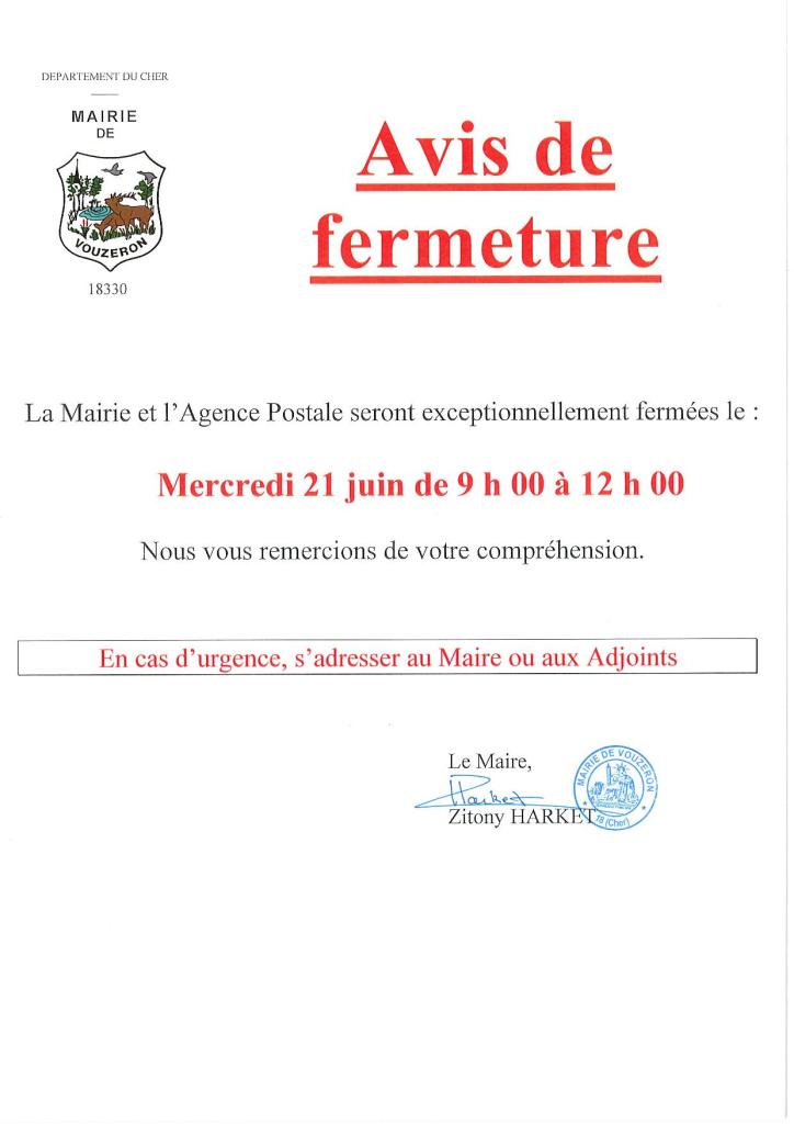Avis de fermeture de la Mairie et de l’Agence Postale le 21 juin de 9 h à 12 h