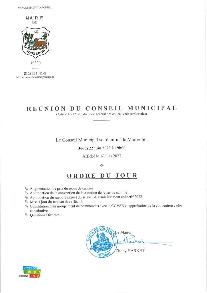 Ordre du jour du Conseil Municipal du 22 juin 2023