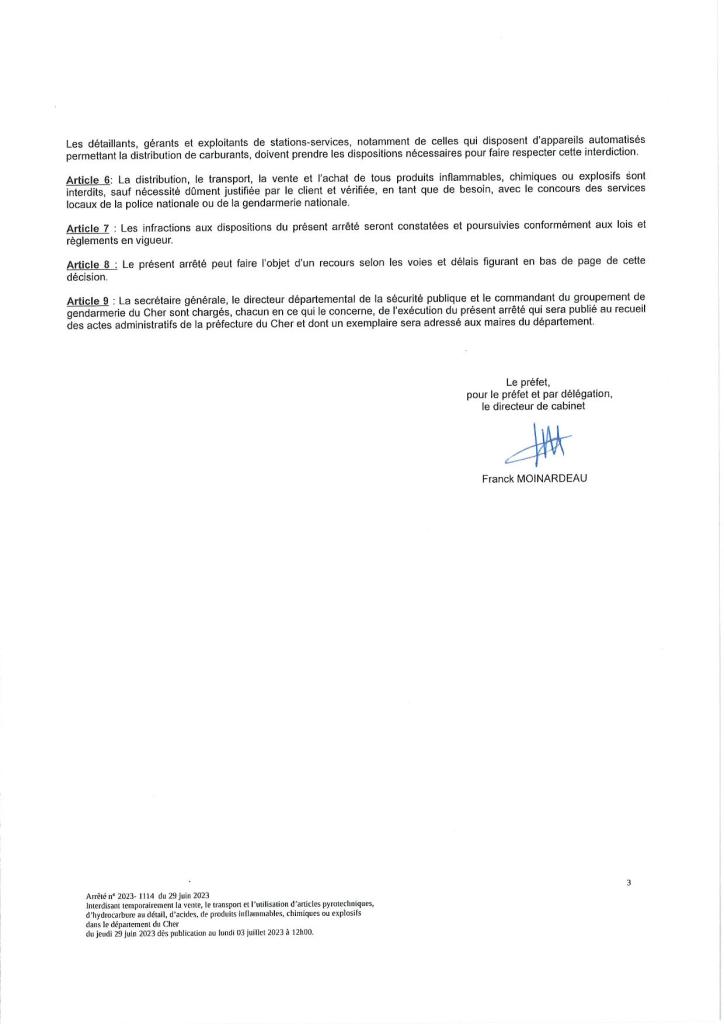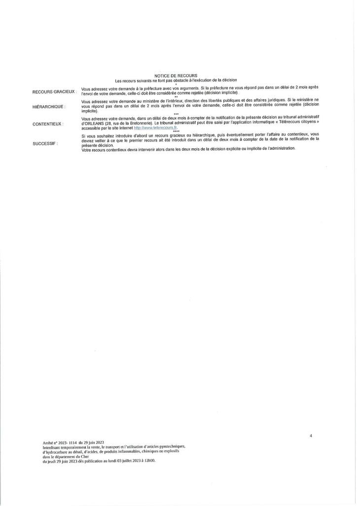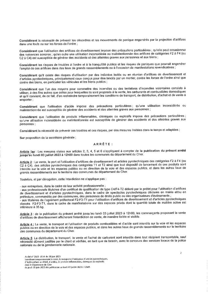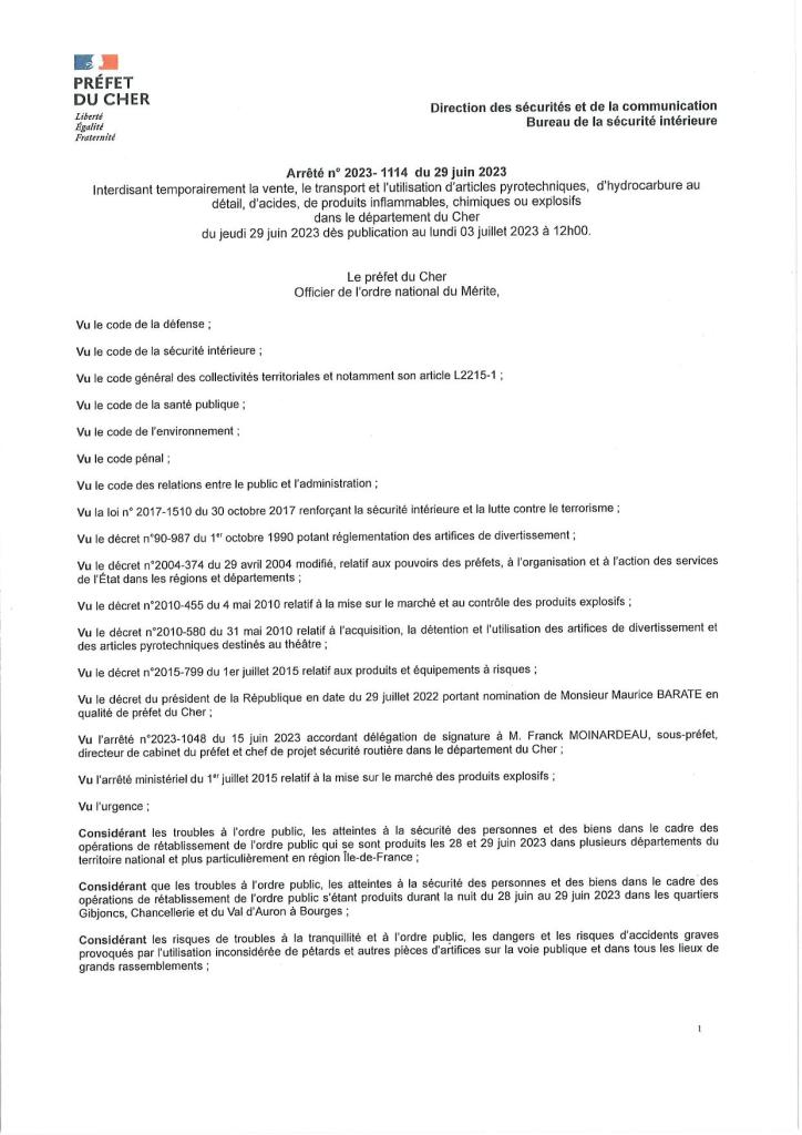 Arrêté n° 2023-1114du29 juin 2023 Interdisant temporairement la vente, le transport et l’utilisation d’articles pyrotechniques, d’hydrocarbure au détail, d’acides, de produits inflammables, chimiques ou explosifs dans le département du Cher du jeudi 29 juin 2023 dès publication au lundi 03 juillet 2023 à 12h00.