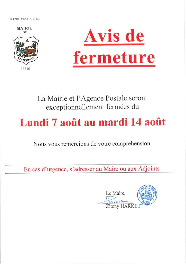 Fermeture d’été de la Mairie et de l’Agence Postale Communale