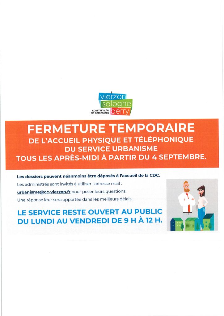 Fermeture temporaire de l’accueil téléphonique et physique du service urbanisme de la Communauté de Communes Vierzon Sologne Berry tous les après-midi à partir du 4 septembre 2023