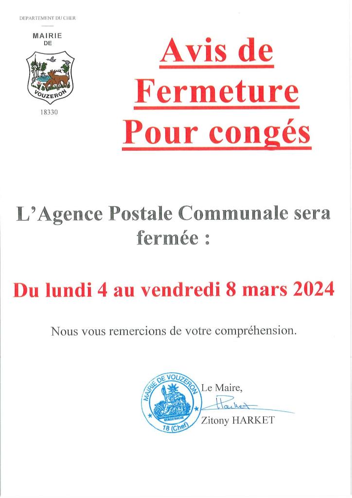 Fermeture de l’ Agence Postale Communale du 4 au 8 mars