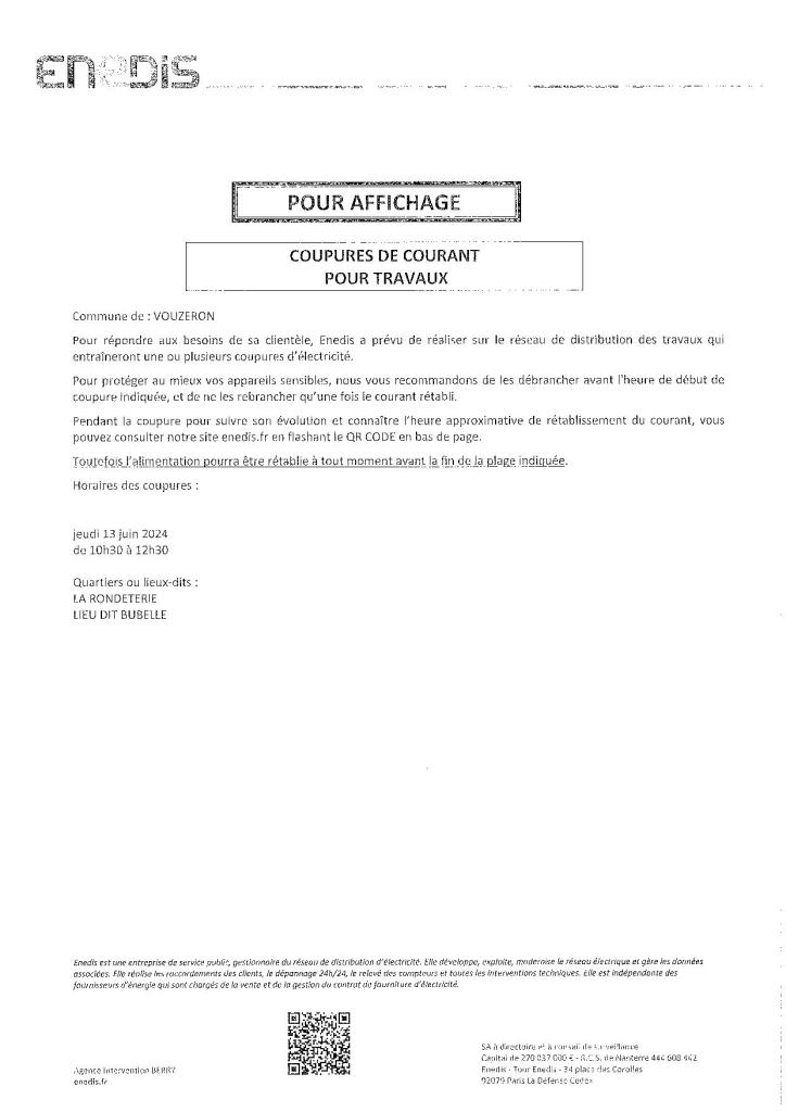Coupure ENEDIS le 13 juin LA RONDETERIE
