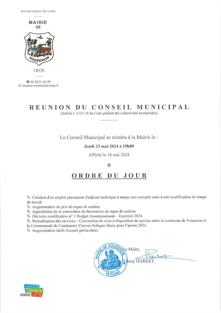Ordre du jour de la réunion du conseil municipal du 23 mai 2024