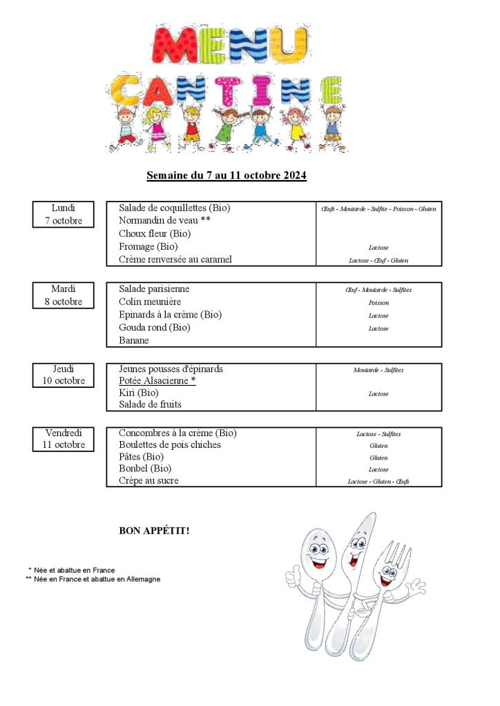 Menu de la cantine scolaire du 7 au 11 octobre 2024
