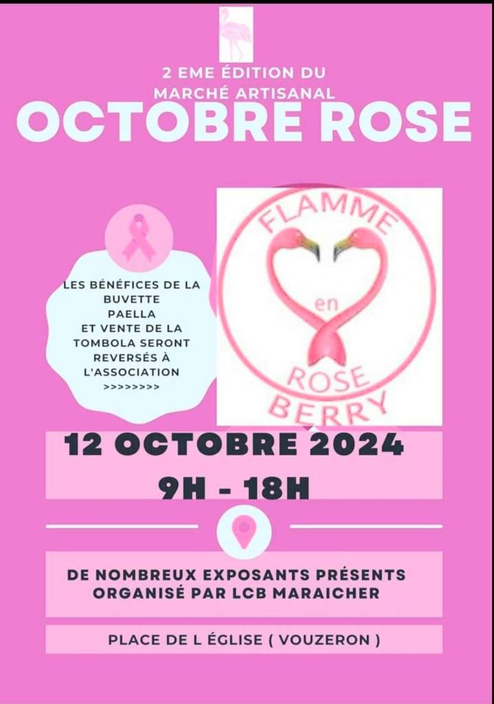 Une vingtaine d’exposants (commerçants, créateurs, artisans) seront présents le 12 octobre au marché artisanal octobre rose 2024. Ouvert de 9h à 18h sur la place de l’église à vouzeron, vous trouverez en plus des nombreux stands, de quoi manger et boire sur place. Une tombola sera organisé. Les bénéfices de la buvette, repas et ventes de la tombola remis à l’association flamme en rose Berry : une association qui aide les hommes, femmes, enfants à se soigner contre tous les types de cancer.