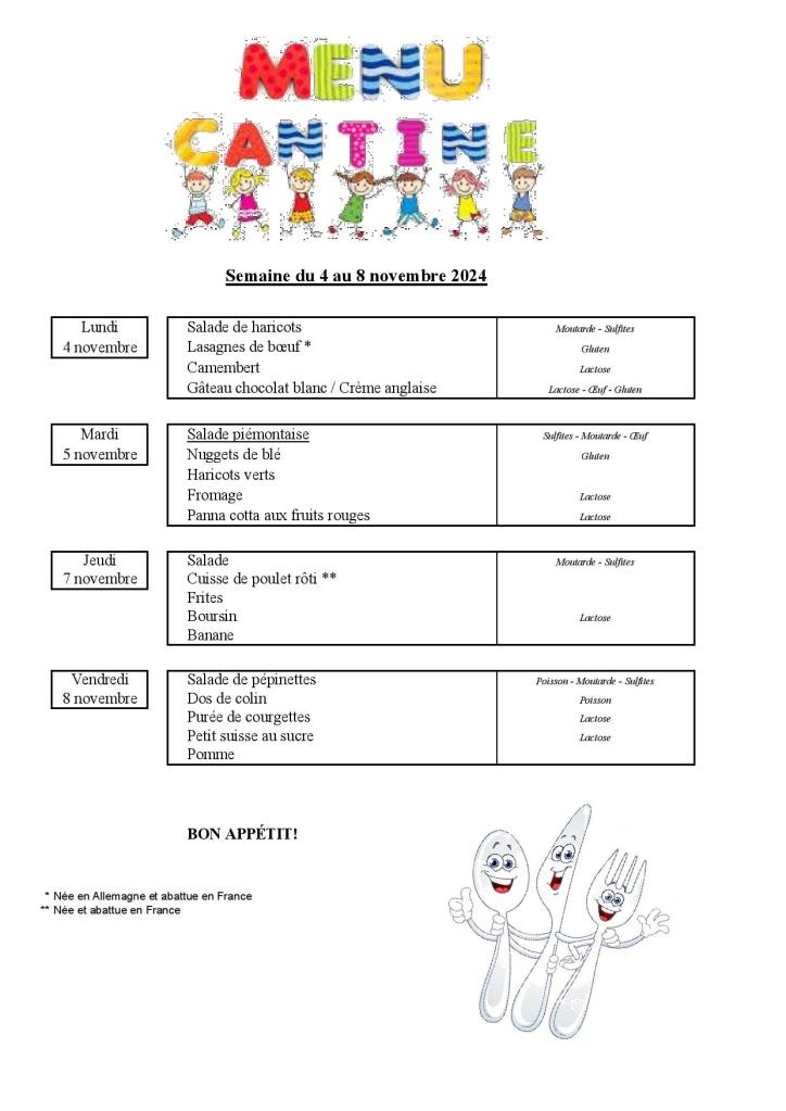 Menu de la cantine scolaire du 4 au 8 novembre 2024