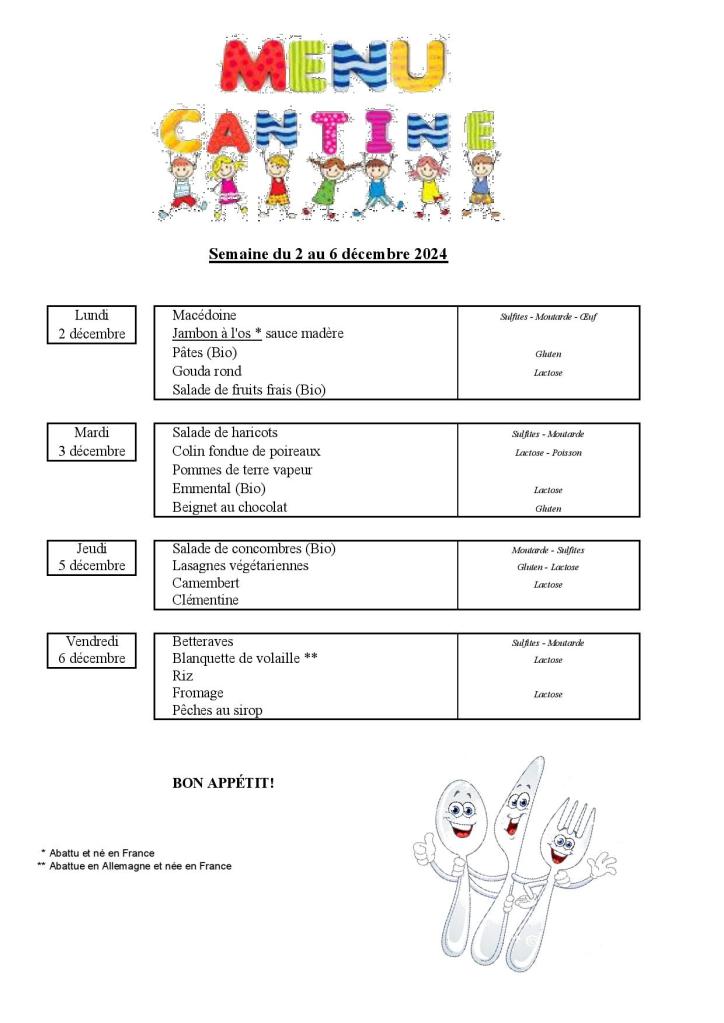 Menu de la cantine scolaire du 2 au 6 décembre 2024