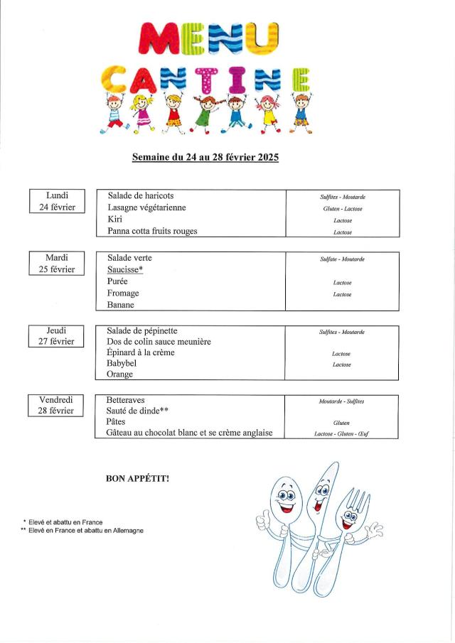 Menu de la cantine scolaire du 24 au 28 février 2025